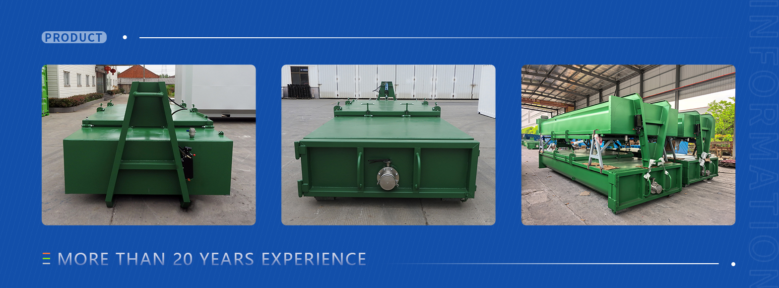 Regarding the surface treatment, we can paint the bins in your color or in H.D.G (4 cubic meter to 20 cubic meter only). In addition, extra steel lids , Flat tray and hooklift container can also be provided here, we welcome you to contact us for more information.